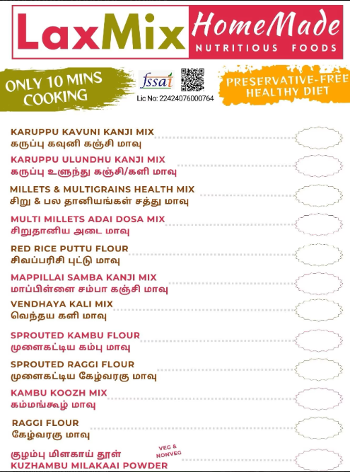 Laxmix Homemade Foods focuses on preparing nutritious and wholesome healthy instant mix products in Sivagami Nagar using traditional methods and carefully selected ingredients. We specialize in homemade instant mixes made from black rice, brown rice, red rice, and a variety of millets to support a balanced and healthy lifestyle. Our products are easy to prepare and ready to eat in just 10 minutes, making them ideal for busy families, working professionals, and health-conscious individuals. We emphasize natural ingredients, hygienic preparation, and authentic taste without compromising on nutrition.
