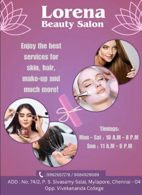 We offer various beauty treatments such as facial, threading, waxing, clean up, bleaching, haircut, hair spa, hair color, manicure, pedicure, bridal makeup, party makeup along with personal care at Lorena Beauty Parlour in Mylapore. Our aim is to give quality service, maintain hygiene, and ensure that every customer feels confident and happy after visiting us.