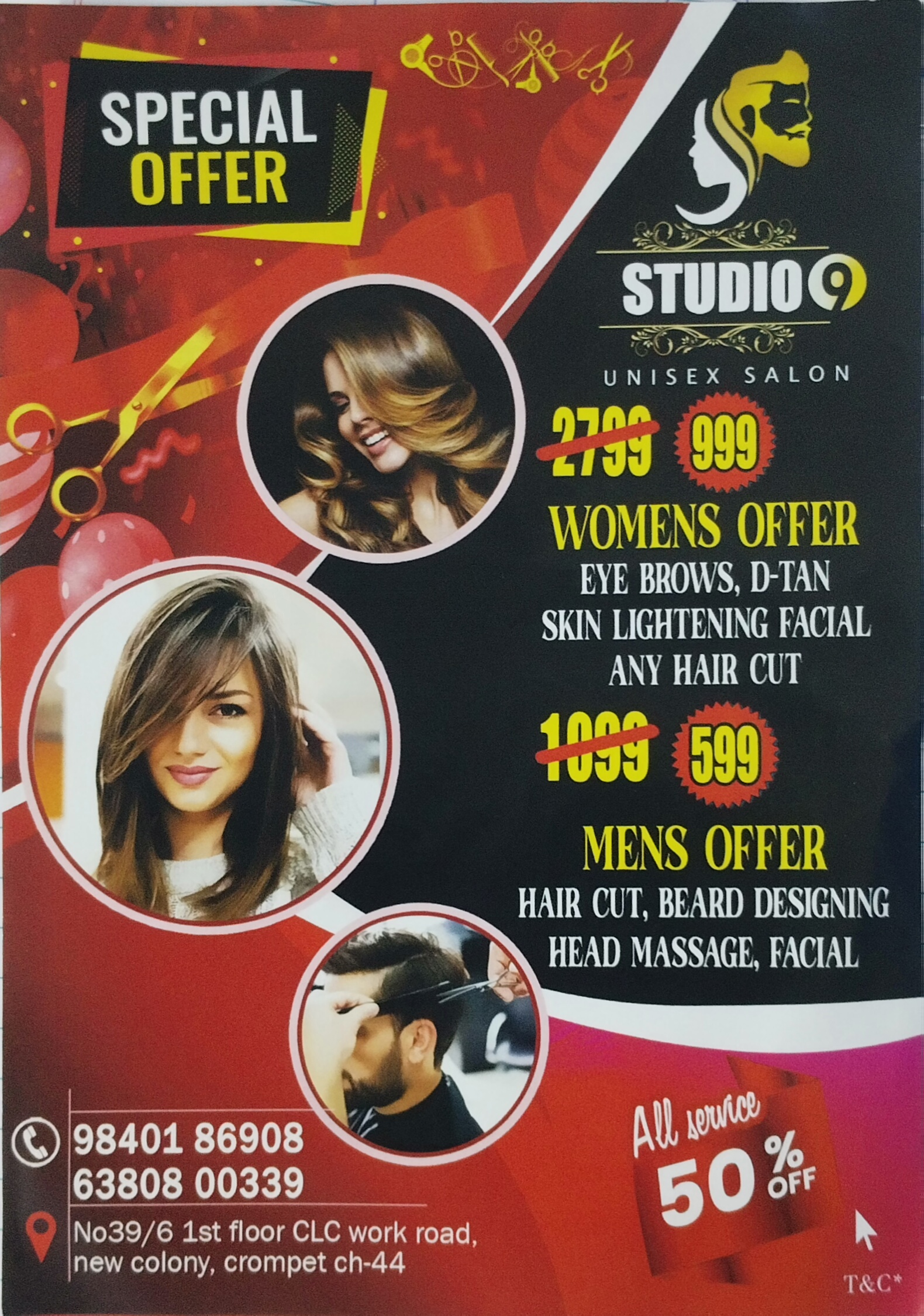 Studio 9: The Best Hair Salon in Chrompet, operated with a focus on personalized Beauty and Grooming services. We offer a variety of services that range from Haircutting, Hair Spa, and Dandruff Treatment to Facial, D tan, Waxing, Threading, Manicure, and Pedicure. We also offer Bridal and Wedding Party Make-up, Kids’ Grooming, and Warts Removal.